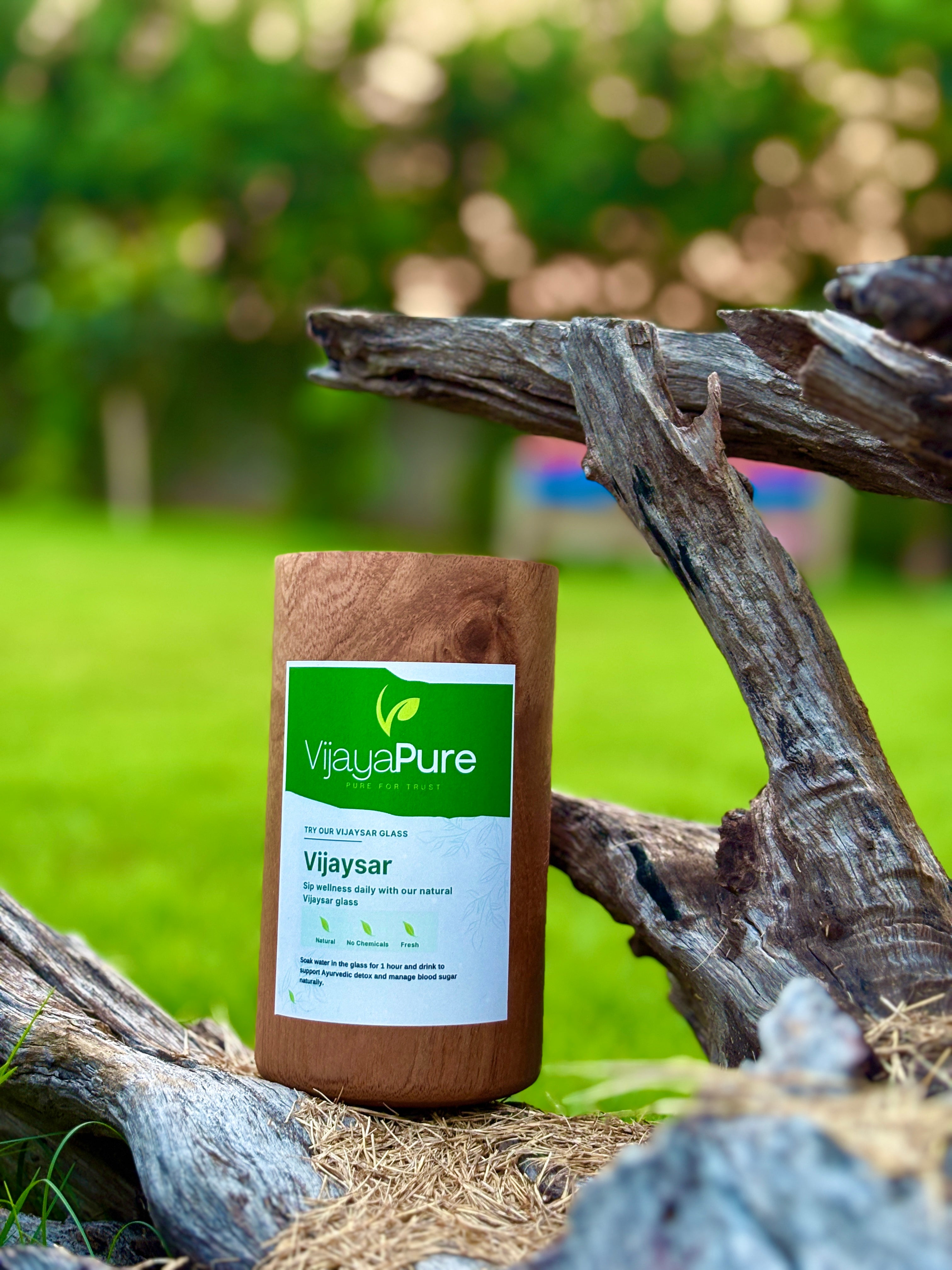 The Vijaysar Wooden Glass is a traditional Ayurvedic remedy made from the heartwood of the Vijaysar tree (Pterocarpus Marsupium). When water is stored in this wooden glass, it turns light reddish-brown and becomes enriched with natural properties that help support overall wellness.
